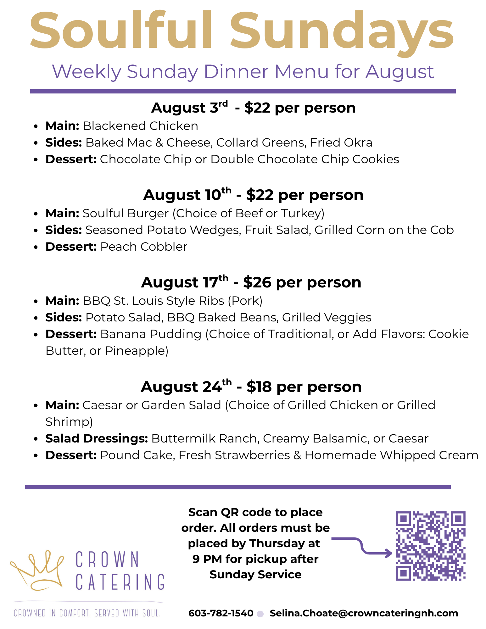 CLICK HERE and fill out our easy online form by Thursdays at 9 PM before the Sunday meal option of your choice. You can even order your meals weeks in advance to plan ahead. Your ready-to-enjoy meal will be waiting for you to pick up right after service on Sunday. It's the perfect way to bring a little extra warmth and flavor to your Sunday.
